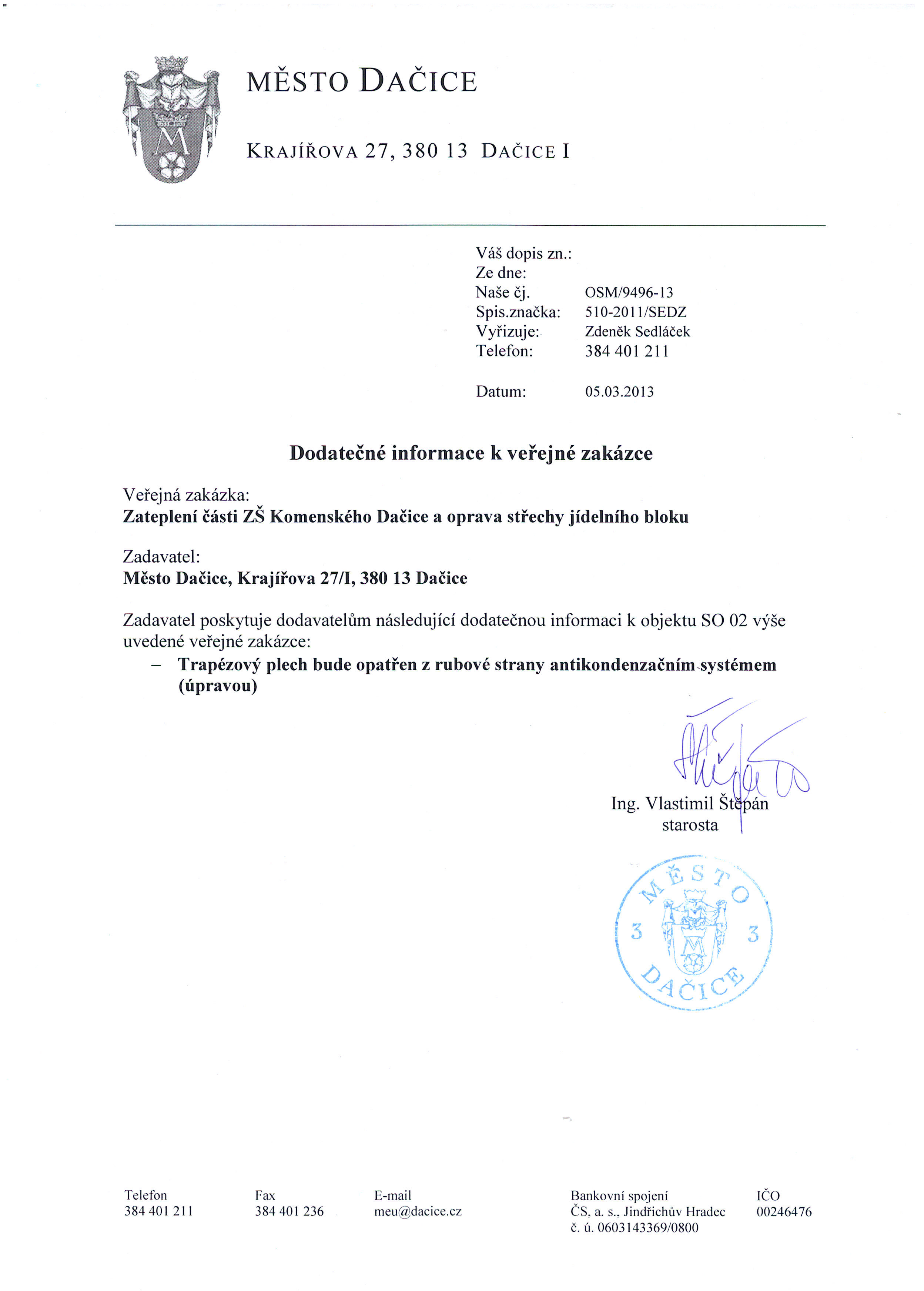 Zadavatel poskytuje dodavatelům dodatečné informace k veřejné zakázce - trapézové plechy budou opatřeny antikondenzační úpravou.